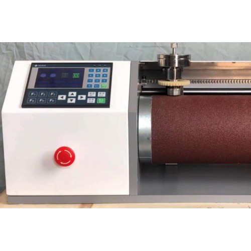 該機主要由動(dòng)力系統、轉動(dòng)錕筒、試樣夾轉器、自動(dòng)停機系統和用于試樣轉動(dòng)的齒條與小傳動(dòng)齒輪裝置、基座及粉塵收集器等組成。其主要原理是:在某個(gè)載荷下,在一定級別的紗布上,柱狀試樣在紗布表面上橫切研磨一確定的行程,通過(guò)測量試樣的質(zhì)量磨耗量,再由試樣的密度計算出體積磨耗量。為了使試驗有可比性,最后須得用標準橡膠,把試驗結果表示為以校驗過(guò)的紗布為基礎的相對體積磨量或是表示為相對于某種標準膠的磨耗量的耐磨基數。